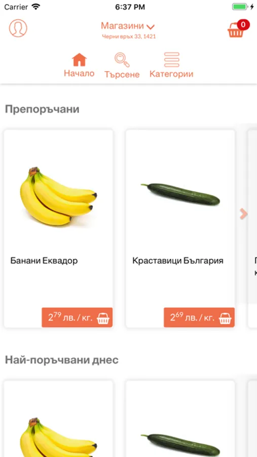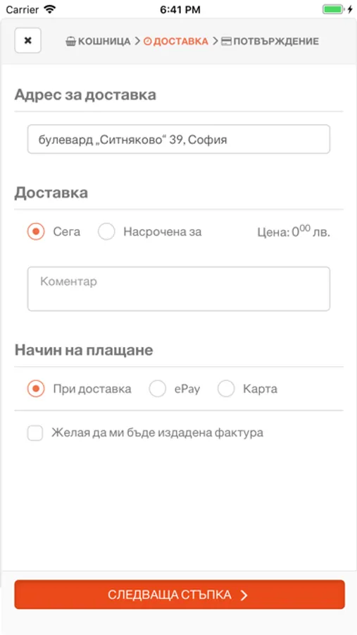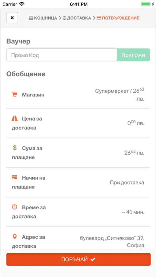 Добавете любимите продукти в кошницата си, изберете време за доставка - веднага или в определен ден и час и поръчайте.