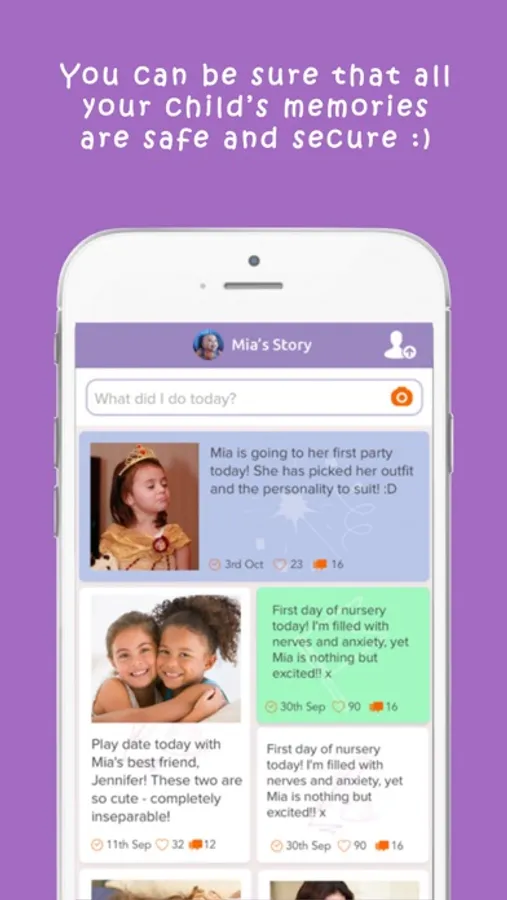 Record all the funny baby stories, precious photos, every milestone - no matter how small – in their "My Story" page of their private baby book. And better yet, invite your family and friends - or Buddies - to share in the joy of your child growing up.