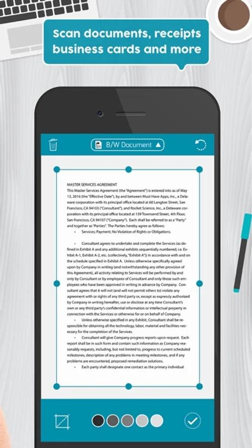 Easy Scanner's built-in advanced scanning algorithm automatically detects borders of the page, corrects perspective and distortion, eliminate shadows and set a perfect contrast for text - black on white.