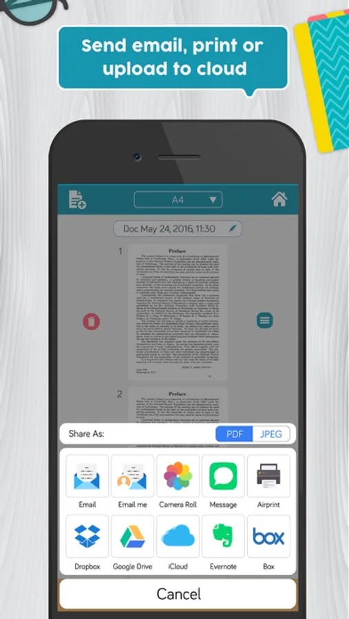 Scanned documents can be emailed, printed, exported to camera roll or uploaded to cloud services like Dropbox, Evernote, Google Drive, iCloud, Box.