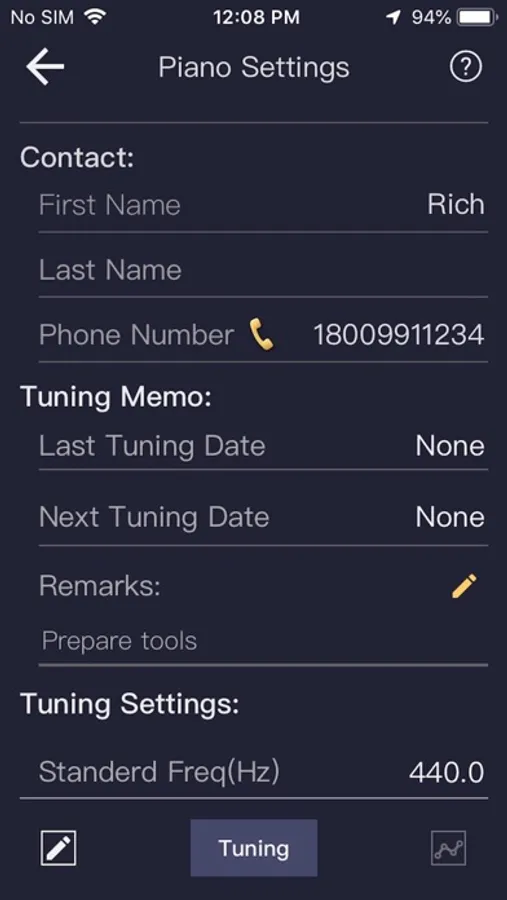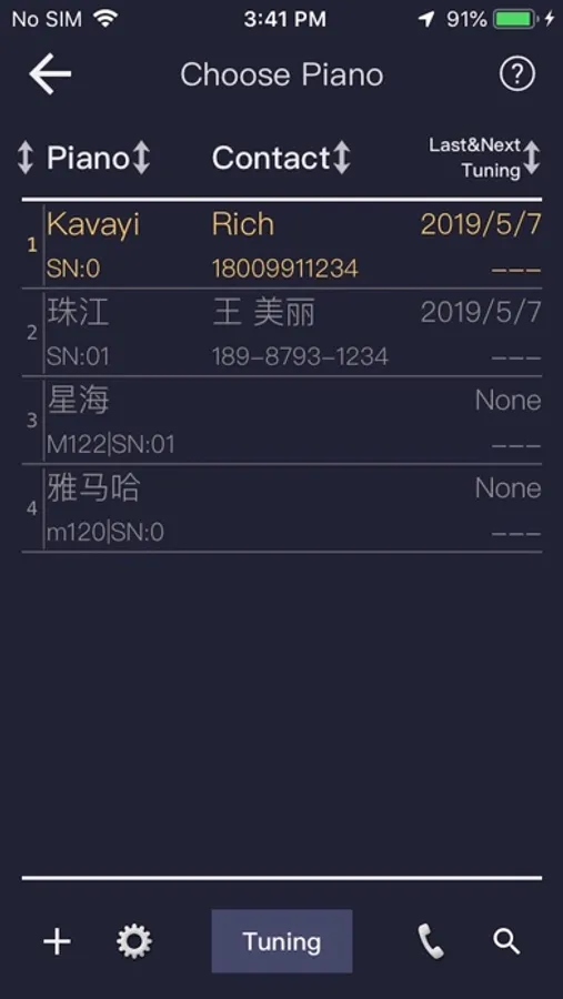 Up to 2000(*) piano settings can be stored. Each piano setup includes the piano brand, model, number, year of manufacture, geographic location, and final tuning time, including name and telephone number of the contact, including tuning curves and standard audio frequencies. You can use the stored geographic location to call the map software navigation, use the stored phone number to make calls or send text messages. Each piano can have up to 4 tuning curves.