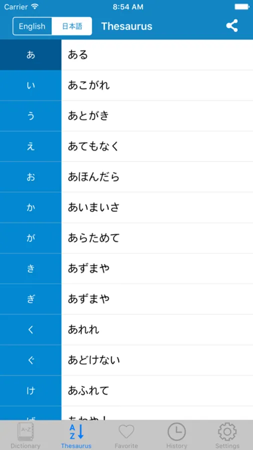 Other than the Japanese to English translation and English to Japanese translation, the app also brings you the history feature where you can find the meanings of your recently searched words as well as the Thesaurus feature where you can search English words as well as Japanese words in alphabetical order and find out their meanings.