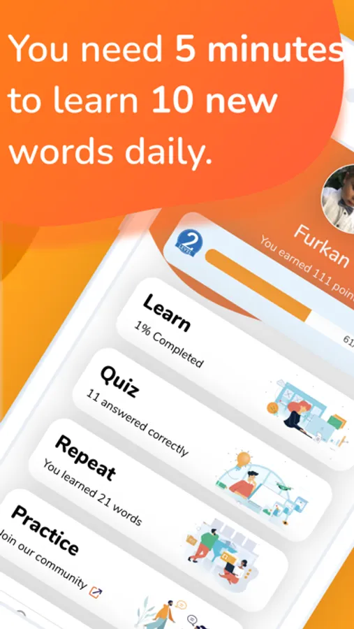 You can learn 10 words a day, 70 words a week, and 300 words a month by taking just 5 minutes every day.