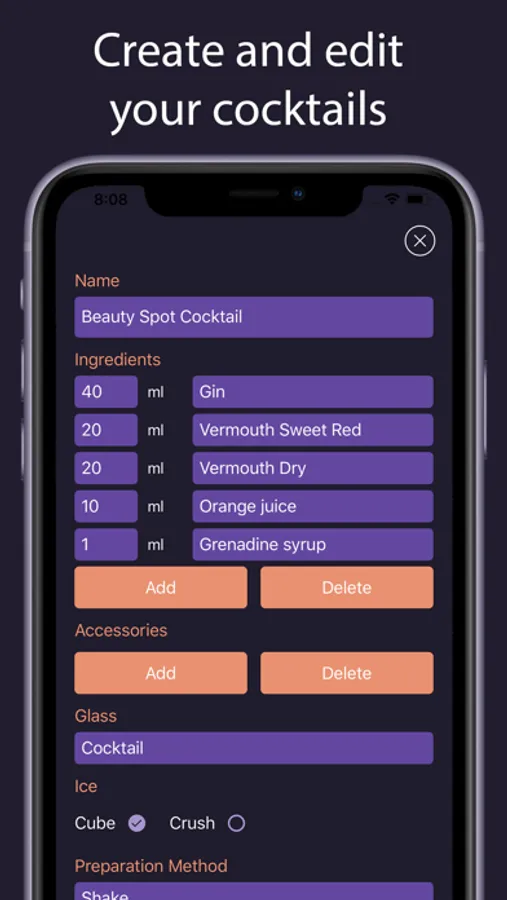 You know a cocktail that not in the out drink app? Add your recipes in "My cocktails" section. The most interest recipes will be added to the app. Make the app your own recipe keeper.