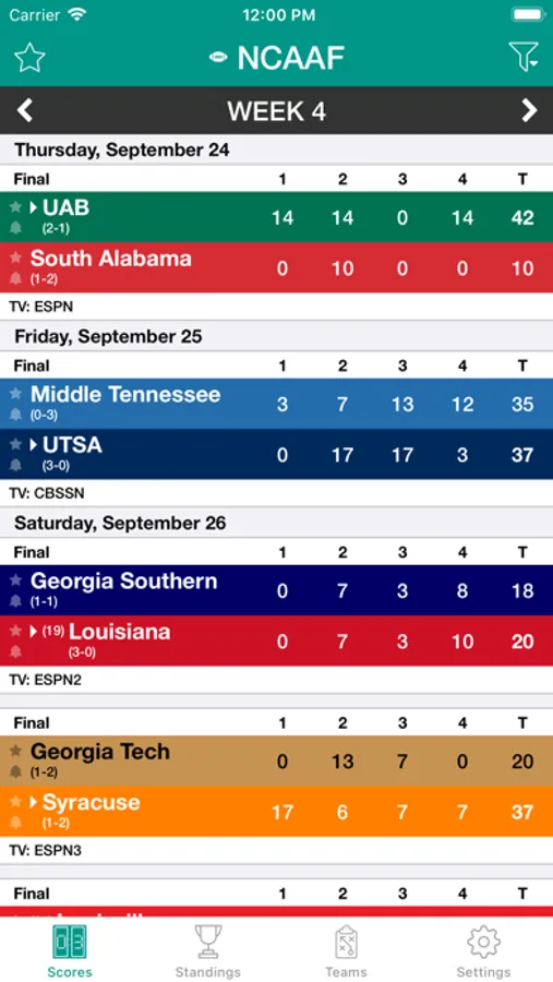 Setup your favorite teams, and view them all on the same page for easy browsing. We made it easy to check out cfb stats and analyze your favorite teams scores throughout the season!