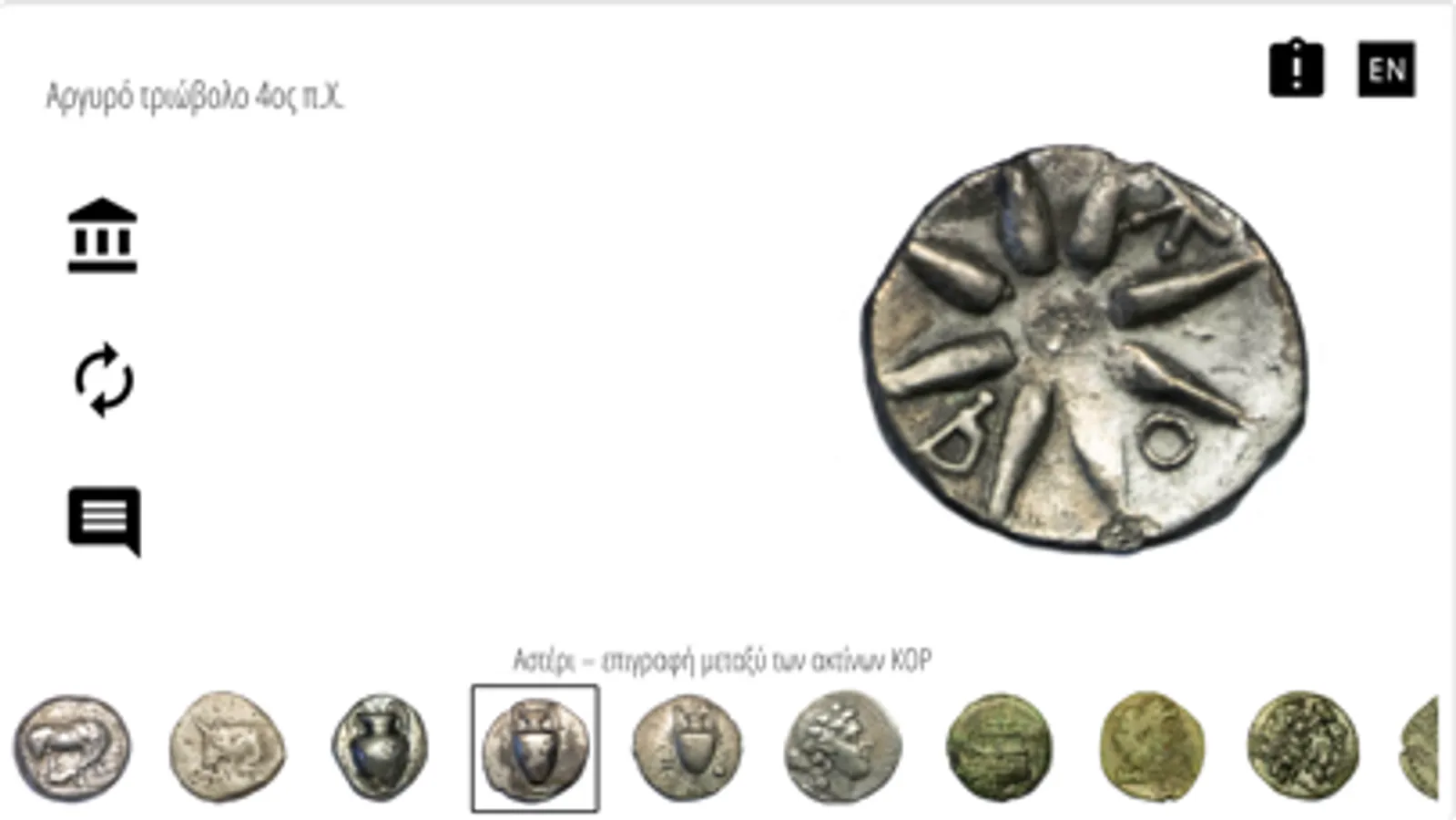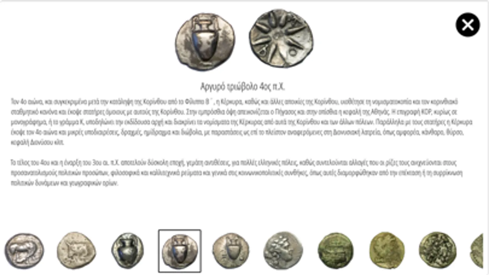 The app depicts the coin collection of the Archaeological Museum of Corfu and provides the user with the ability to digitally examine the various type of coins displayed.