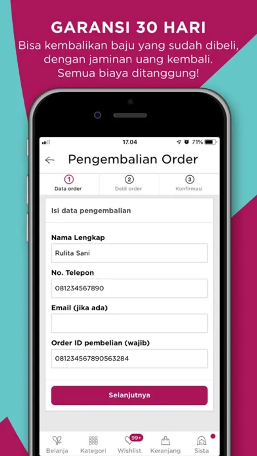 Pesanan yang nggak cocok bisa Sista kembalikan dalam waktu 30 hari & dijamin uang kembali.