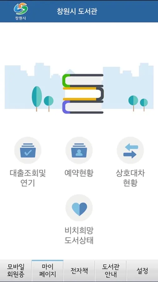 창원시 도서관의 도서검색, 모바일회원증, 도서관 안내, 전자책, 대출조회 및 연기 등의 기능을 이용할 수 있습니다.