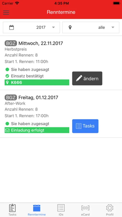 Ermöglicht die einfache Zu- und Absage von Rennterminen. Die Renntermine werden übersichtlich angezeigt und der eigene Zusagen-Status ist jederzeit einsehbar.