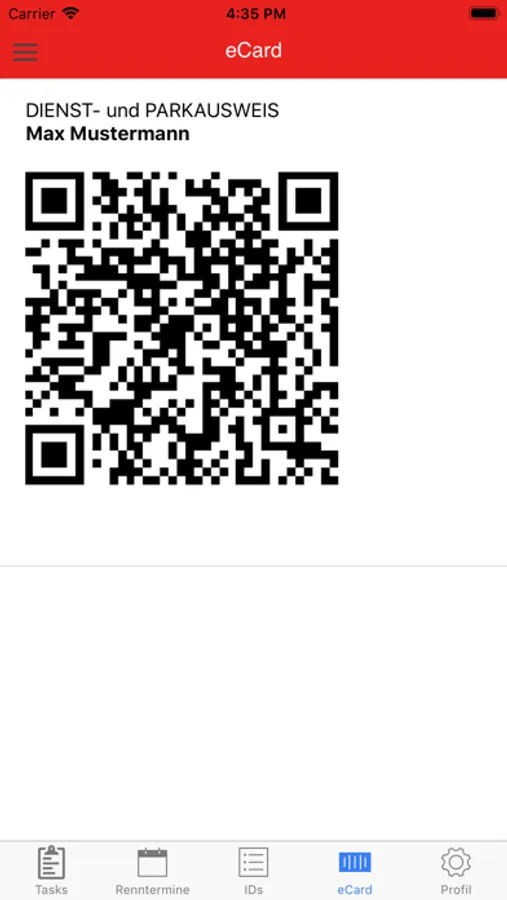 Die in der App angezeigte eCard dient auf der Rennbahn als Dienst- und Parkausweis. Der Wachdienst verfügt über eine entsprechende Scanner-App, um die Gültigkeit der eCard zu überprüfen.
