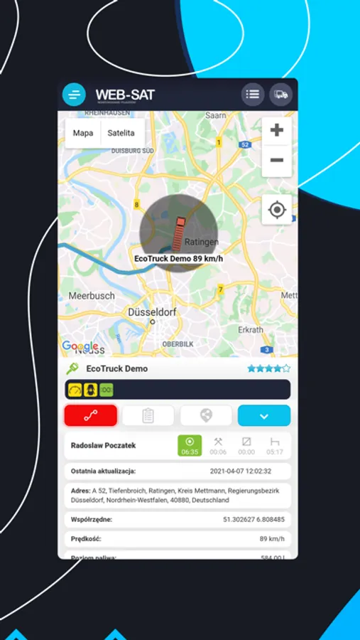 Aplikacja służy do monitorowania położenia i parametrów pracy pojazdu. Aplikacja umożliwia: