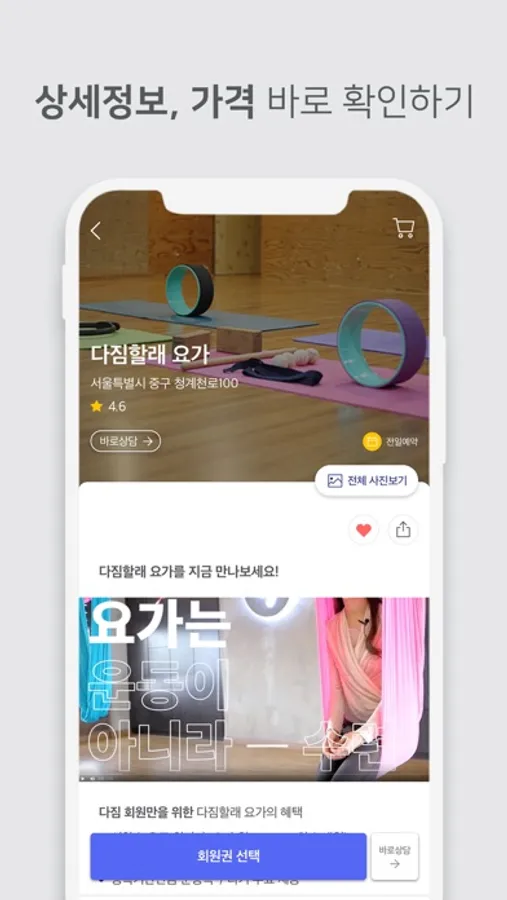 다짐이 직접 촬영한 40여장의 사진과 상세한 최신 가격 정보를 통해 이제 번거롭게 방문하지 않아도 운동시설을 알아볼 수 있어요.