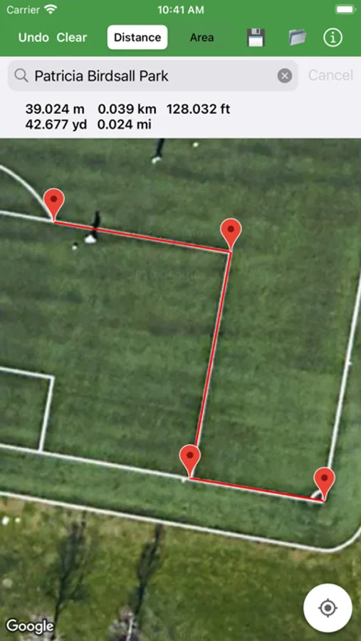 Search any address worldwide. Save and load your measurements with a table interface. Select between Hybrid, Satellite, Terrain, or normal Google Maps.