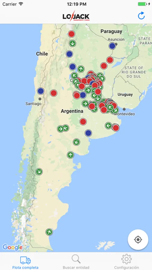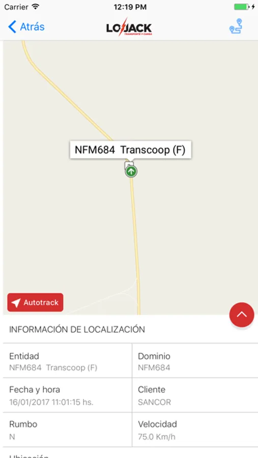 Por medio de esta aplicación se puede conocer la ubicación de toda la flota de vehículos, ver detalladamente el vehículo/recurso, su status y el recorrido realizado.