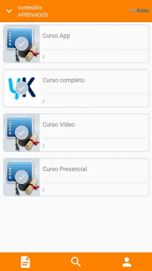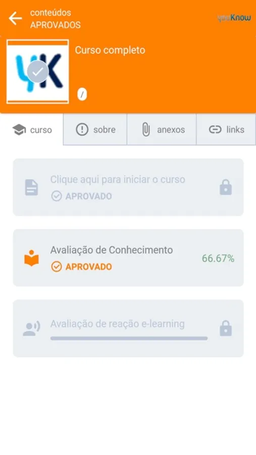 - Acesse os cursos onde se encontra matriculado e que a empresa autoriza a realizar via yK App, navegando por status do curso: não iniciado, em andamento, concluídos ou incompletos;