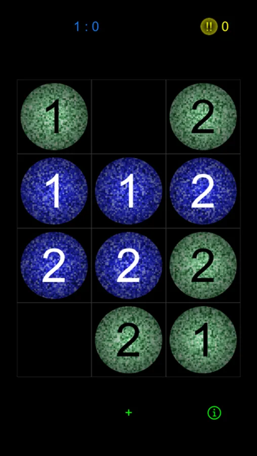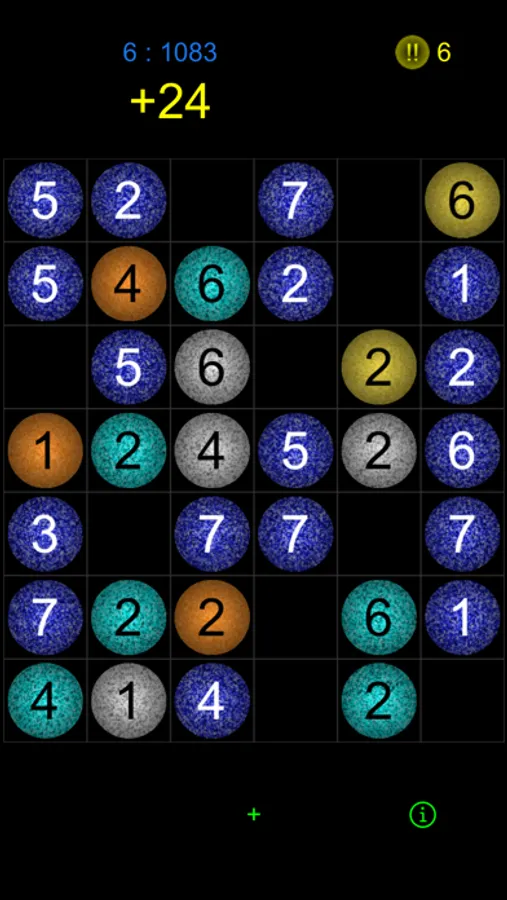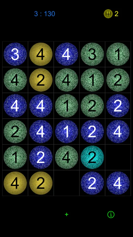 The game starts with a 3x4 grid, then moves up to 4x5, 5x6 and finally infinite levels at 6x7. The number of colors increase up to 8, and the numbers on the stones keep increasing as you level up. If you find that there are no more stones to match but you haven't cleared the board, you can use bonus points to get more stones - each bonus point is worth two new stones. The game ends if you can't clear a level and you run out of bonus points.