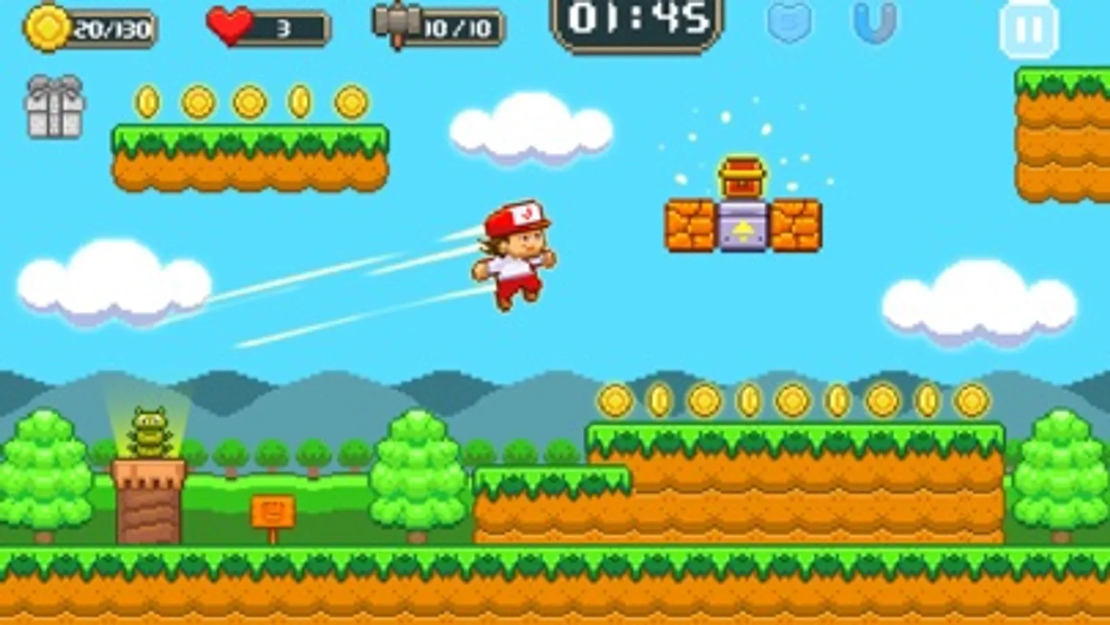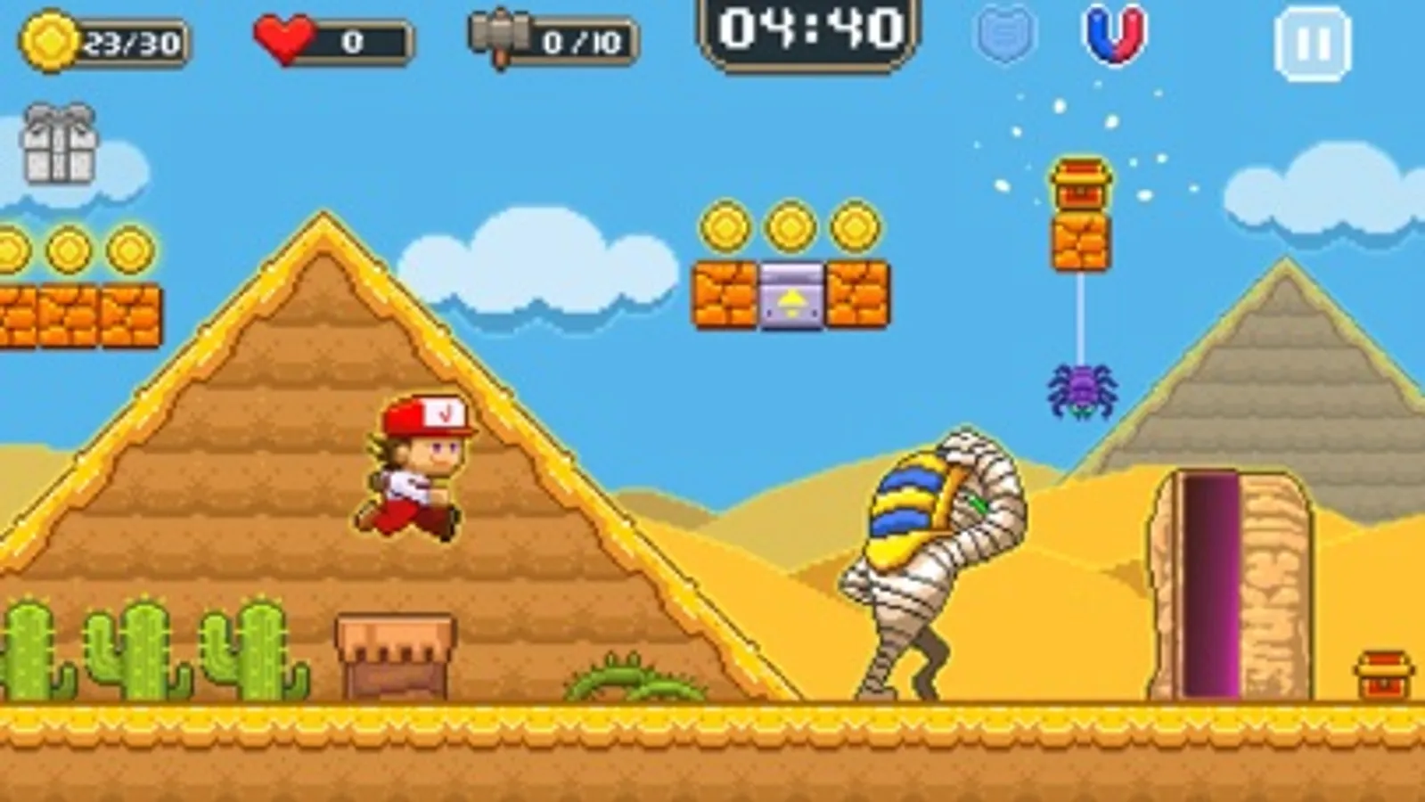 Control buttons to run, jump and explore the arcades. Travel across dangerous jungle, desert, machinery base, etc. Collect coins, gold, acceleration props to help you defeat the Monster!