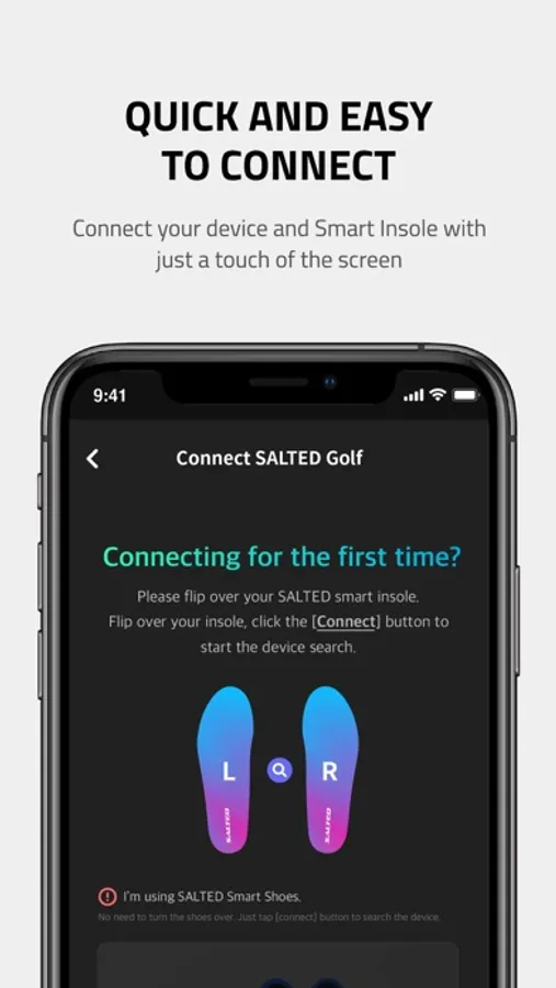 SALTED GOLF is an application that connects to SALTED smart insoles via Bluetooth to help golfers improve their swing.