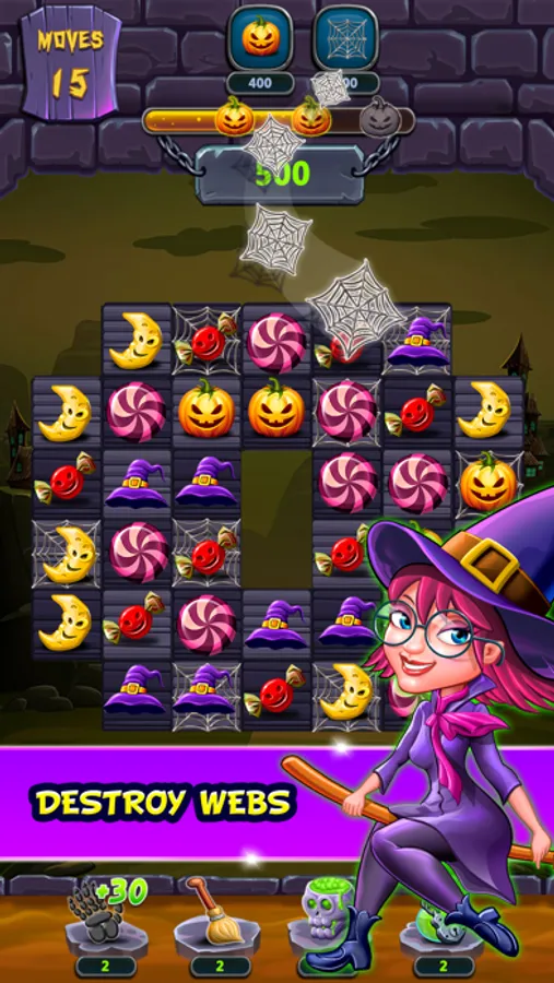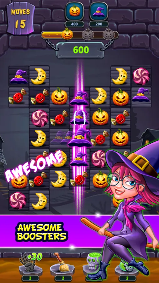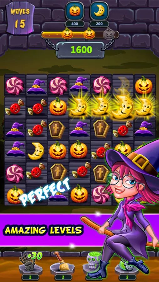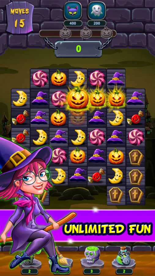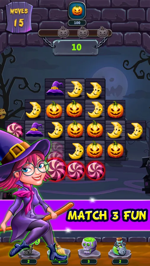 Match and play with unique properties like pumpkins, hats, half-moons, pots, witch candies and more. Collect various magical powers like the magic skull, power broom, monster hand and gas pots by playing strategically for combining more than three properties at the same time. Wheel spinning helps you get lucky power ups to use in the game play and complete the challenging levels. Play like a wizard and stand-up among the fun witch games match 3 lovers.