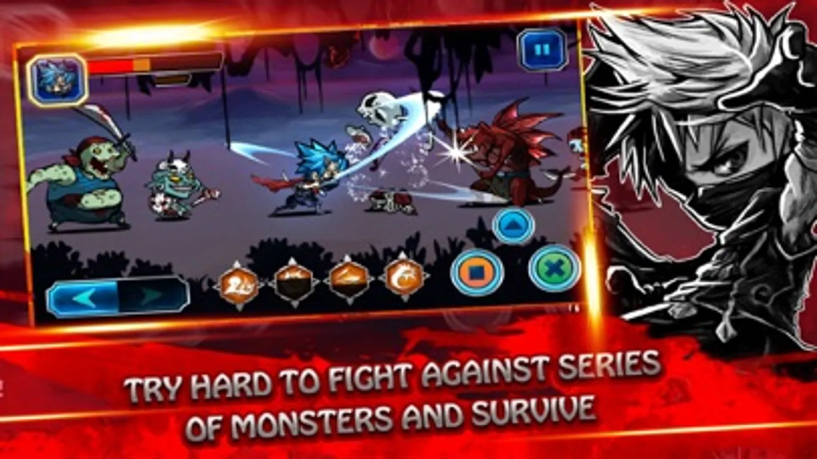 In this fast paced ninja game,Your task is to fight against the monsters, zombies, kill the king of monsters, zombies, collecting more energy ball and items to get powerful weapons