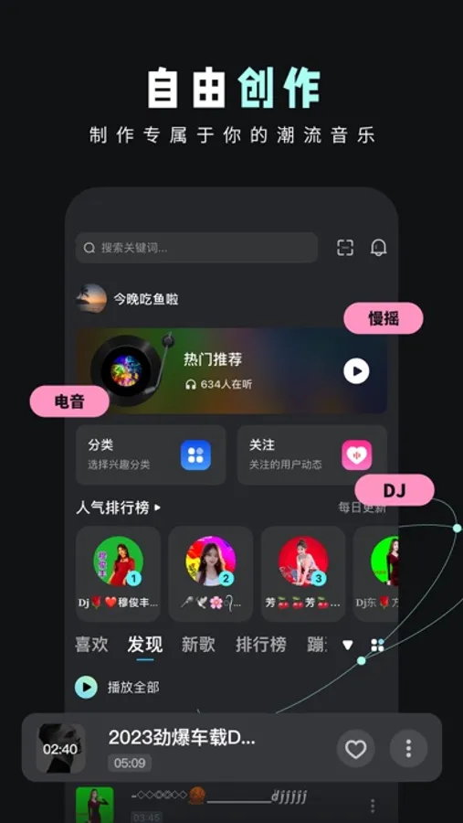 快下载DJ音乐库App,超劲爆DJ嗨曲、MC喊麦、社会摇……等你一起嗨起来~