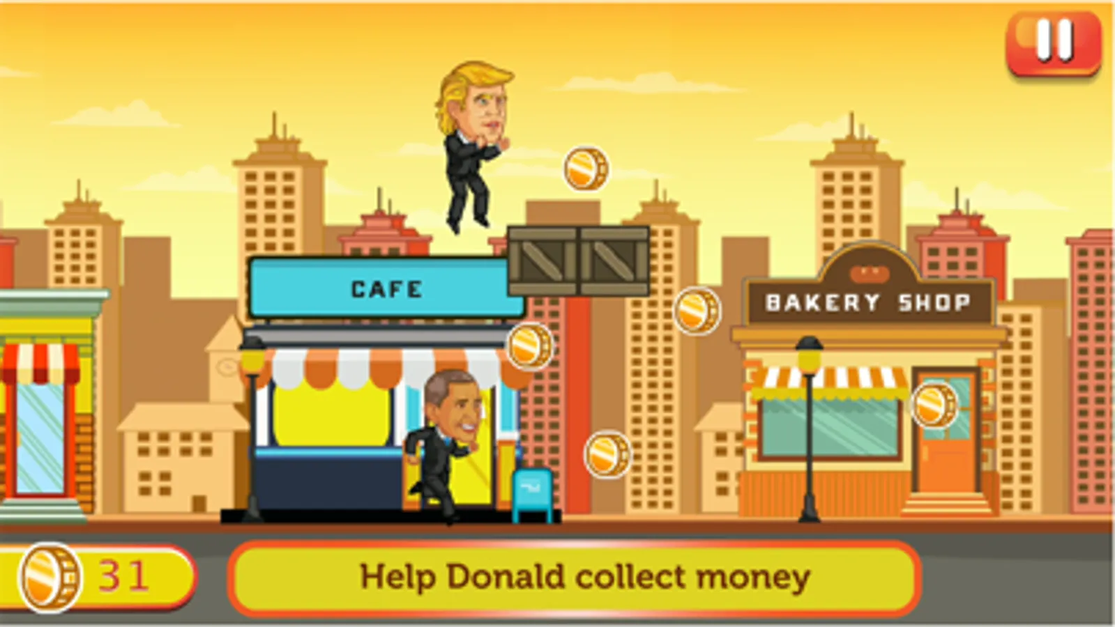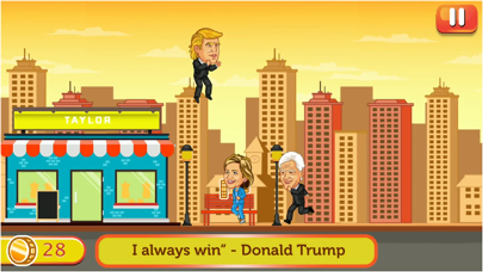 This Donald Trump jump game is not a simple one. Even though the controls are smooth and easy, the game is still challenging. You will discover Barack Obama, Hillary Clinton, and Bill Clinton along with President Trump. They will create so much trouble for the President. Don't get any hit by them, whenever they approach, just tap and tap to jump over them.