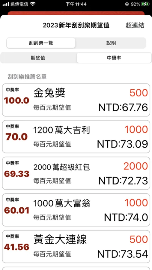 • 2023年新春刮刮樂列表密技、對獎連結 中獎率、期望值 一目瞭然。