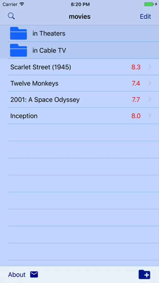 MovieScore is an Apple Watch App to ask the rating of any movie, and to maintain list of desired movies to watch and their scores. You can say to the watch the movie title and the App will use filmaffinity service to get the rating of the film, showing it in the watch. You don't need open the phone anymore.