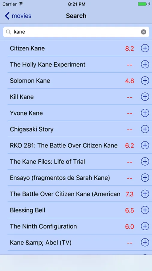 MovieScore will show you in the watch all the movie titles matching your search and, if you want to store the title and rating to watch after, simply you must select the movie title in the result list.