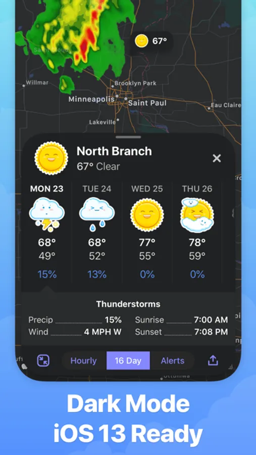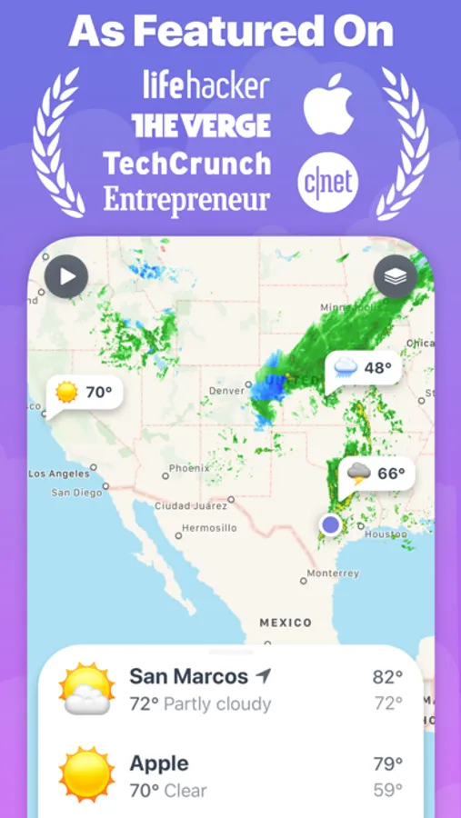 Weather Up is your window into current weather conditions. See layers of weather info right on the map, with forecast data available at a glance. The list lets you quickly check the weather in all your favorite locations.