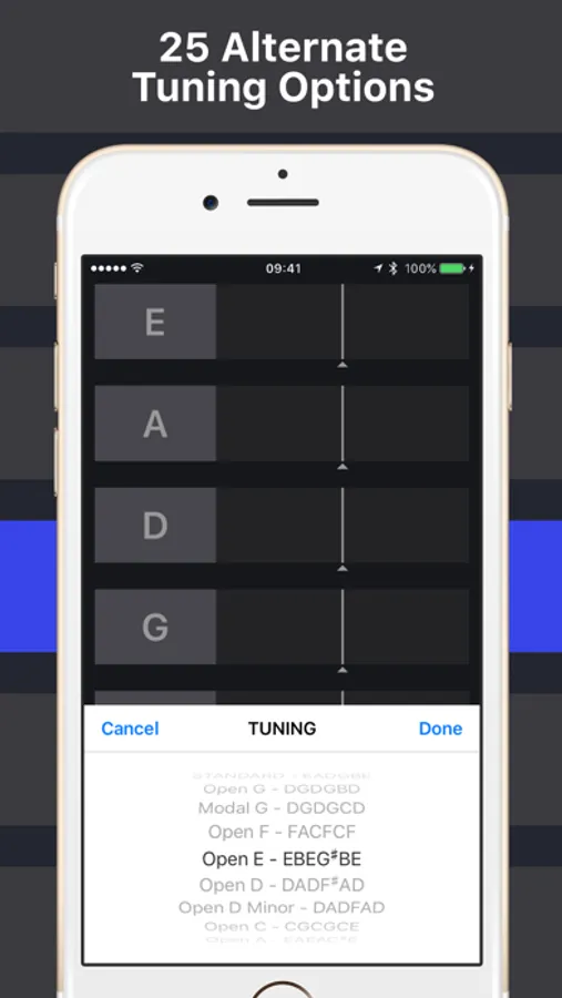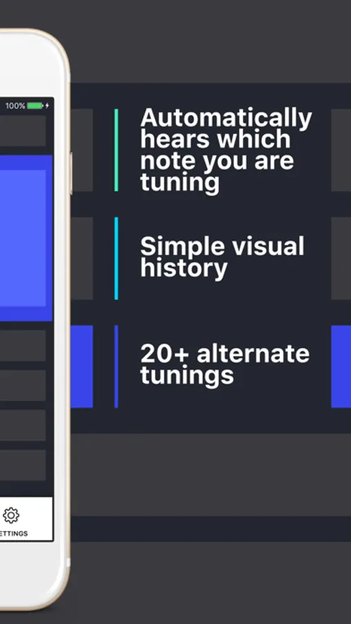 Guitar Tuner+ is a simpler way to tune your guitar. It automatically hears which string you are tuning and expands that area for maximum visibility. When you are done tuning that string, it's last tuned position is saved on screen so you can see your tuning progress. Tap any note name to play a reference pitch to tune by ear.