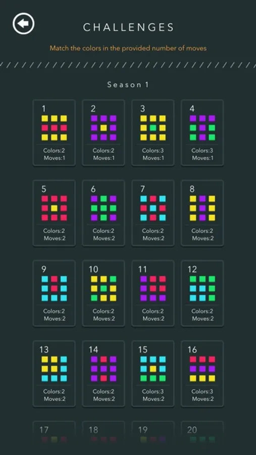 40 challenges will put your mind skills to the test. With a set number of limited moves, you’ll have to match the colors presented in every challenge.