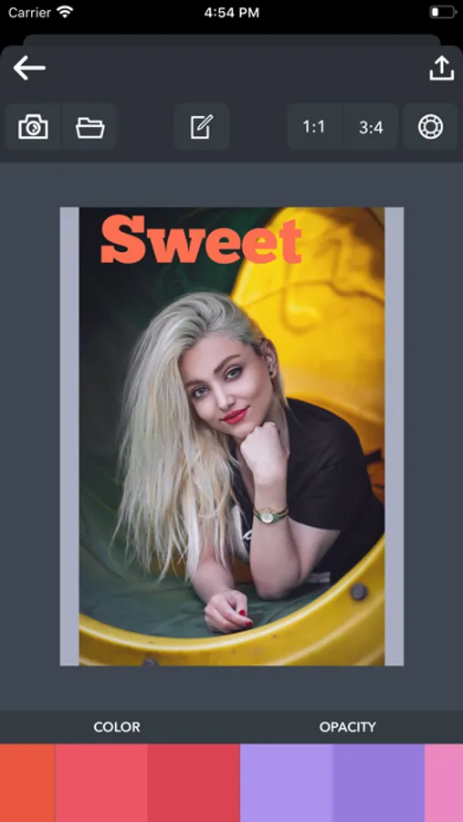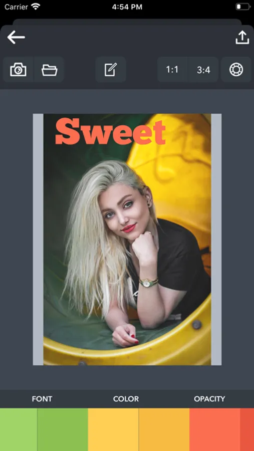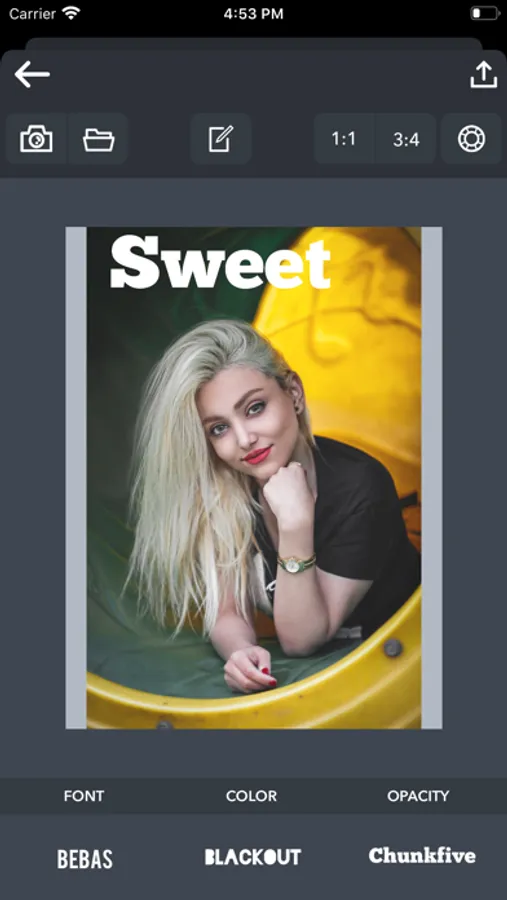 Select your Image from Camera or Library. Enter your text and experiment with the options. Stylize the text however you want. Move and scale photo and text to make better composition.