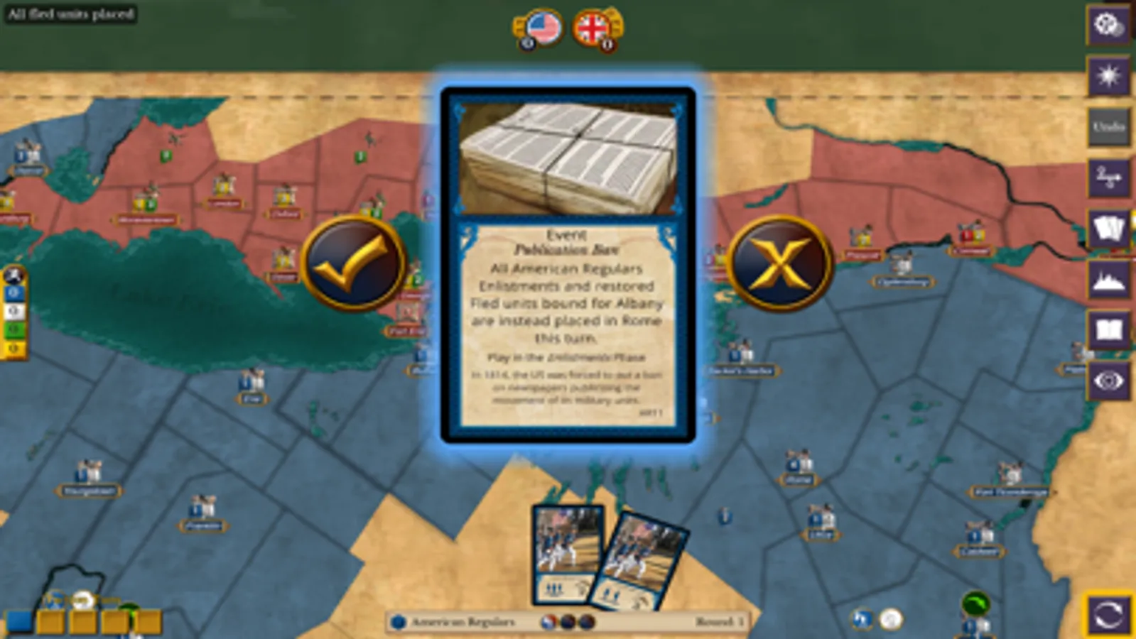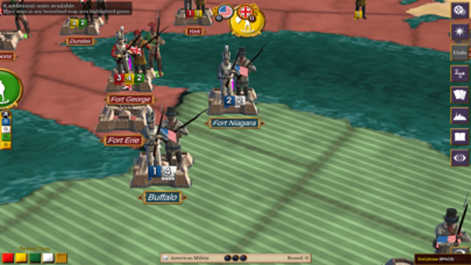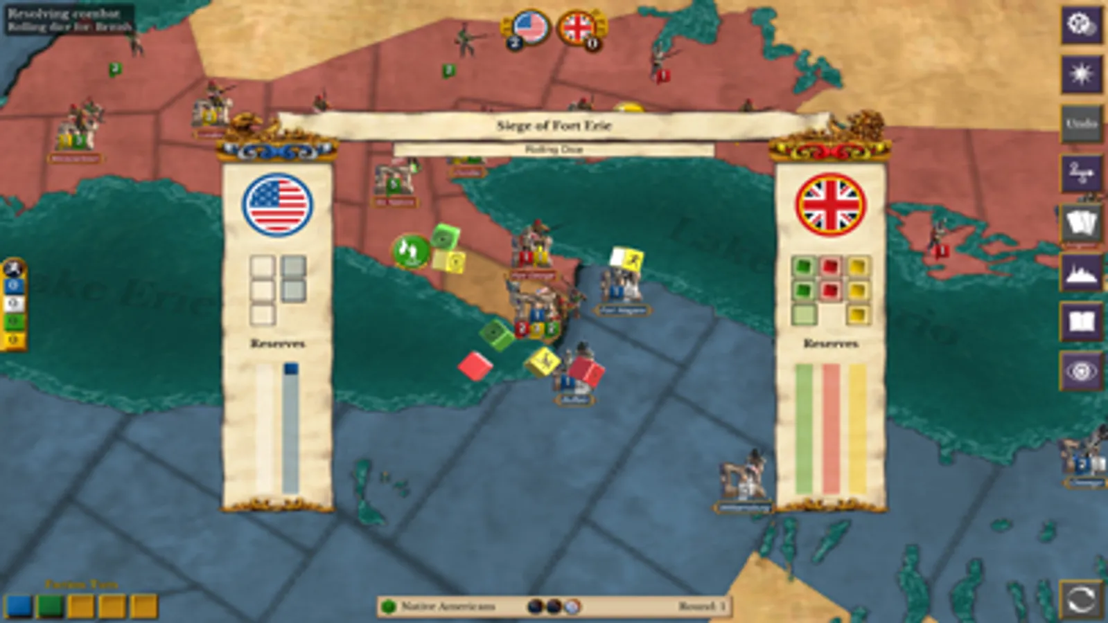 The year is 1812. Great Britain and her allies are battling Napoleon for control of Europe. In response to British seizure of American ships and goods, the young United States declares war on Britain and invades Canada. You and up to 4 other players take command of the armies of the British Redcoats, Canadian Militia, and Native Americans, or of the American Regulars and American Militia to decide the fate of the Americas. The action takes place on a huge historically accurate map that spans the United States and Canada from Detroit to Montreal. Players from each faction cooperate to gain control of key towns and forts.