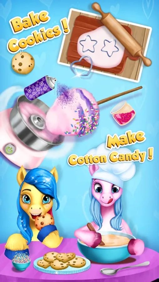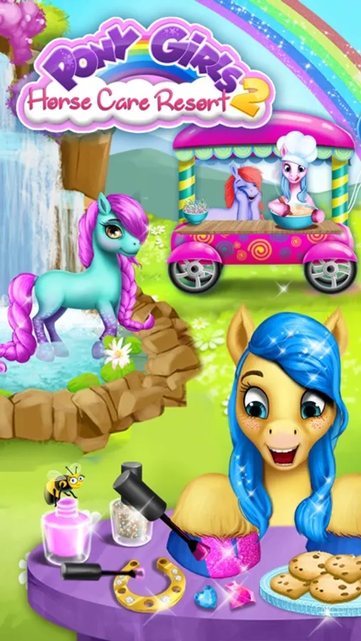 Meet the four beautiful Pony Girls - Cherry, Crystal, Windy and Bubbles - and play the best pony games for girls in your dream Horse Care Resort! Do the most beautiful manicure, make delicious cotton candy and cookies, craft the cutest necklace, run a pony hair salon, design your dream pony outfit, treat little ponies if they get hurt and have fun in the waterfall spa. Take care of your little friends in the new pony adventure full of rainbows and sparkles!