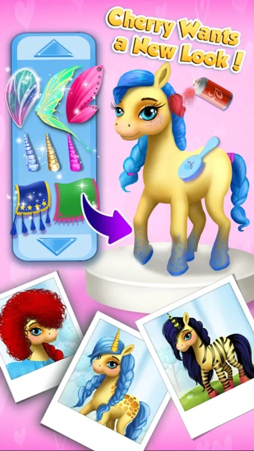 · Pony girl Cherry is ready for dress up! Mix and match colorful wings, hairstyles, unicorn horns, stylish horseshoes and crazy cute tattoos!