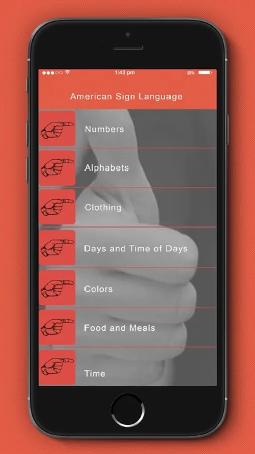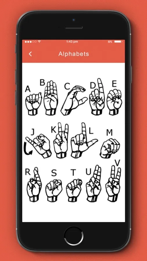 ASL app for beginners consists of a huge array of signs accompanied with clear images describing the respective action . The signs have been organized into various sections which start with basics such as alphabets and numbers. The list of sections further goes on to include greetings , question words , days and time of the day , clothing , family members and people , emotions , colors , meals , health , opposites , nature and the weather , sentence formations and more .