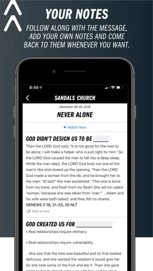 Follow along during sermons, add your own notes and keep them with you. Listen to the Debrief or watch past sermons.