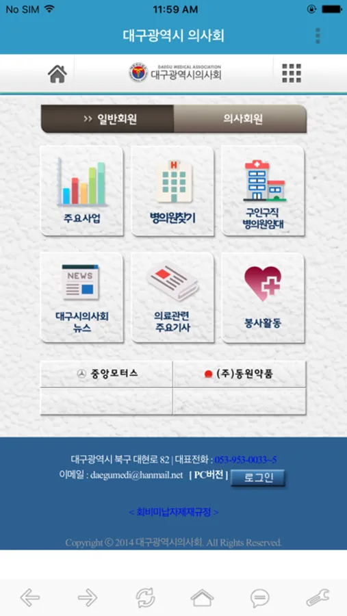 대구광역시의사회는 오랜 역사와 전통을 자랑하는 전문 직능단체로서 회원에게 신속 정확한 정보를 전달하기 위하여 모바일 앱을 운영중에 있습니다.