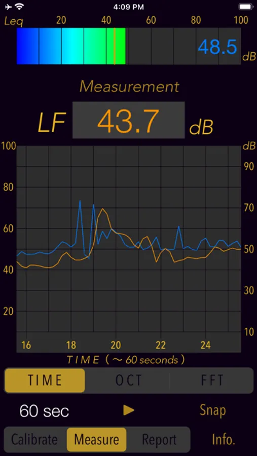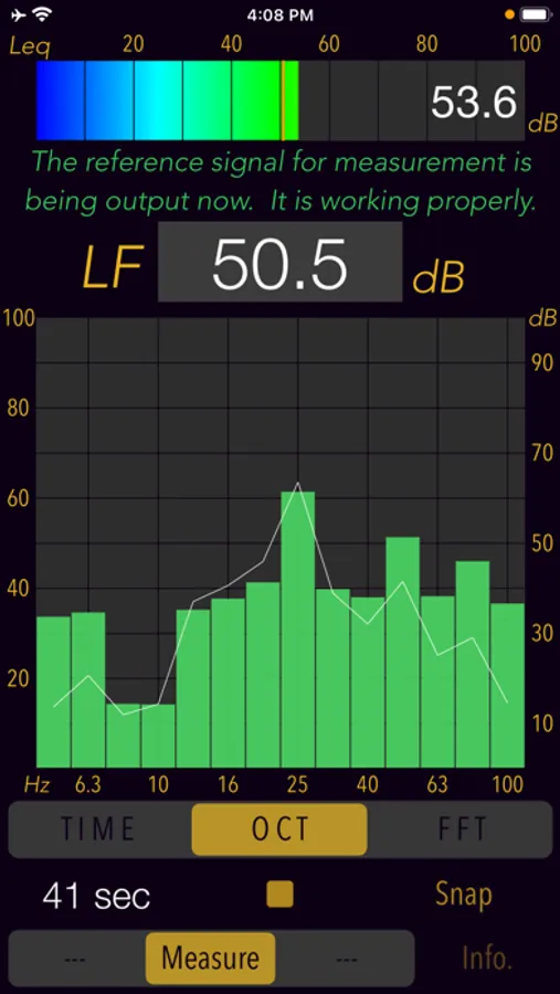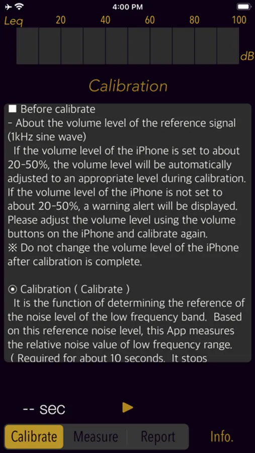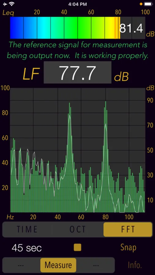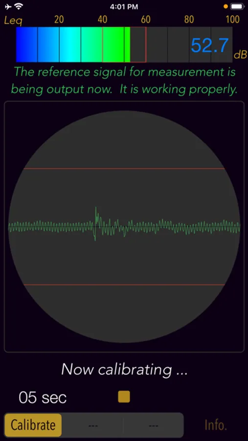 1) Calibration (Calibrate): A reference signal (1kHz sine wave) is output to determine the reference noise level for the low frequency component. If the volume level of iPhone is set to about 20-50%, the calibration will automatically adjust it to the optimum volume level for the reference signal.