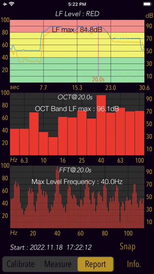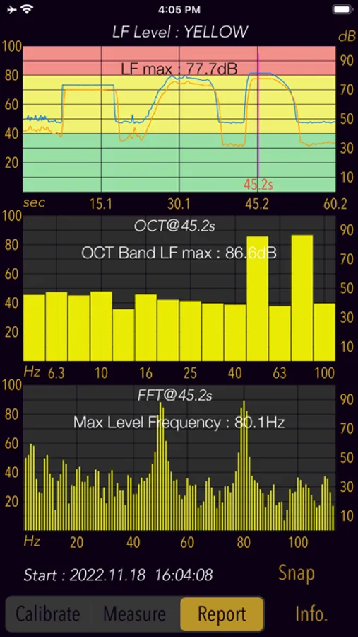 This app also allows you to examine the frequency component of the low frequency sounds by 1/3 octave band analysis and FFT analysis.