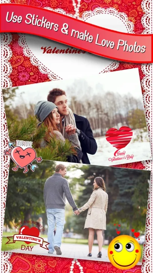 With Valentine love photo stickers you can take a regular photo and apply over stickers to create unique looking picture in seconds.