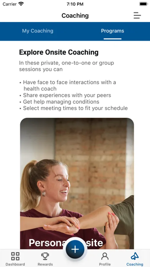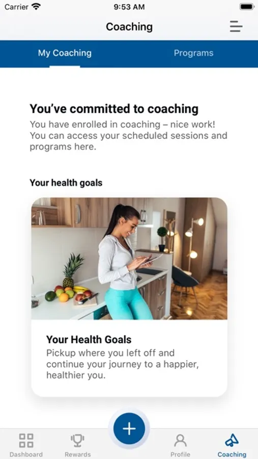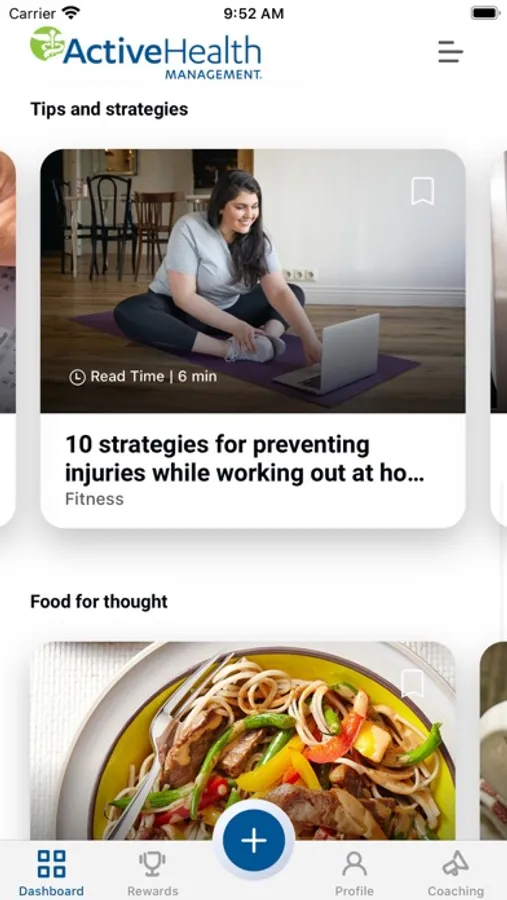 • Use the health dashboard to find health actions and activities to complete in the app as well as view articles and healthy recipes