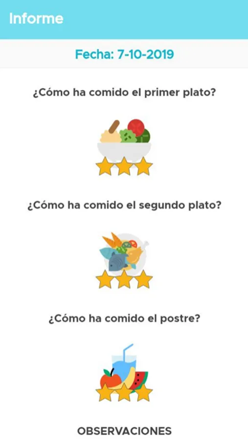 Tras una secuencia de pantallas, podréis observar cómo ha comido su hija o hijo, así como el comportamiento en el comedor y en las actividades de ocio y tiempo libre.