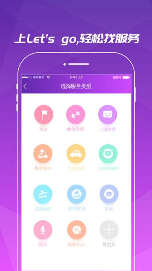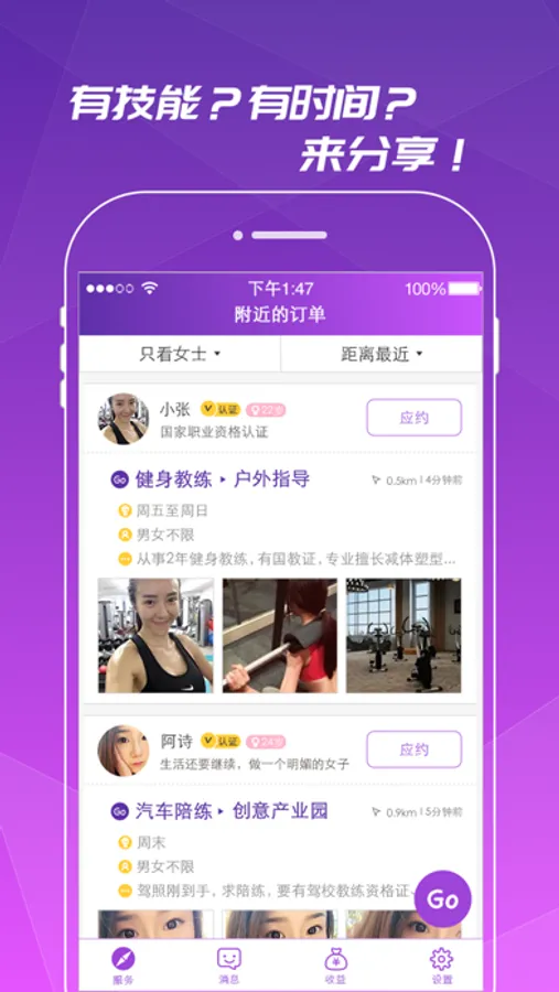 Let's go!是一个时间售卖与技能交易的平台,致力于帮助更多有时间或有技能的人迅速变现!如果你有需求:这里有众多的技能达人,你可以任意购买Ta的时间或技能,快速约到他,上Let's go!,开启一段奇妙之旅吧。