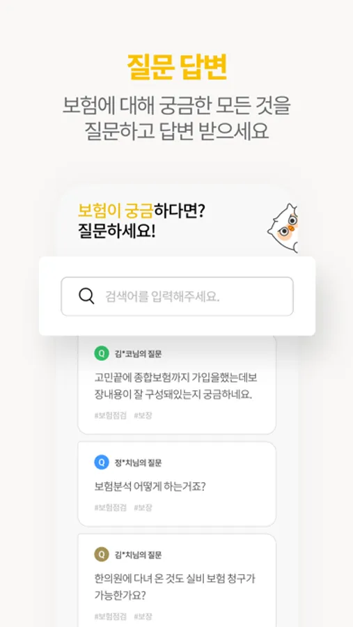 보험에 대해 궁금한 것이 있다면 질문을 등록하고, 보험 전문가의 신속한 답변을 받아보세요. 보험금 청구에 관한 질문부터, 가입 중인 보험에 대한 질문까지. 보험에 관한 것이라면 무엇이든 물어보실 수 있습니다.