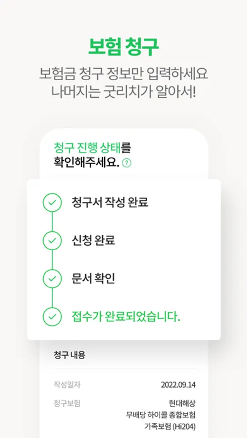 보험금 신청은 굿리치에게 맡겨주세요. 필수 정보와 병원 서류만 등록해 주시면 나머지는 굿리치가 알아서!
