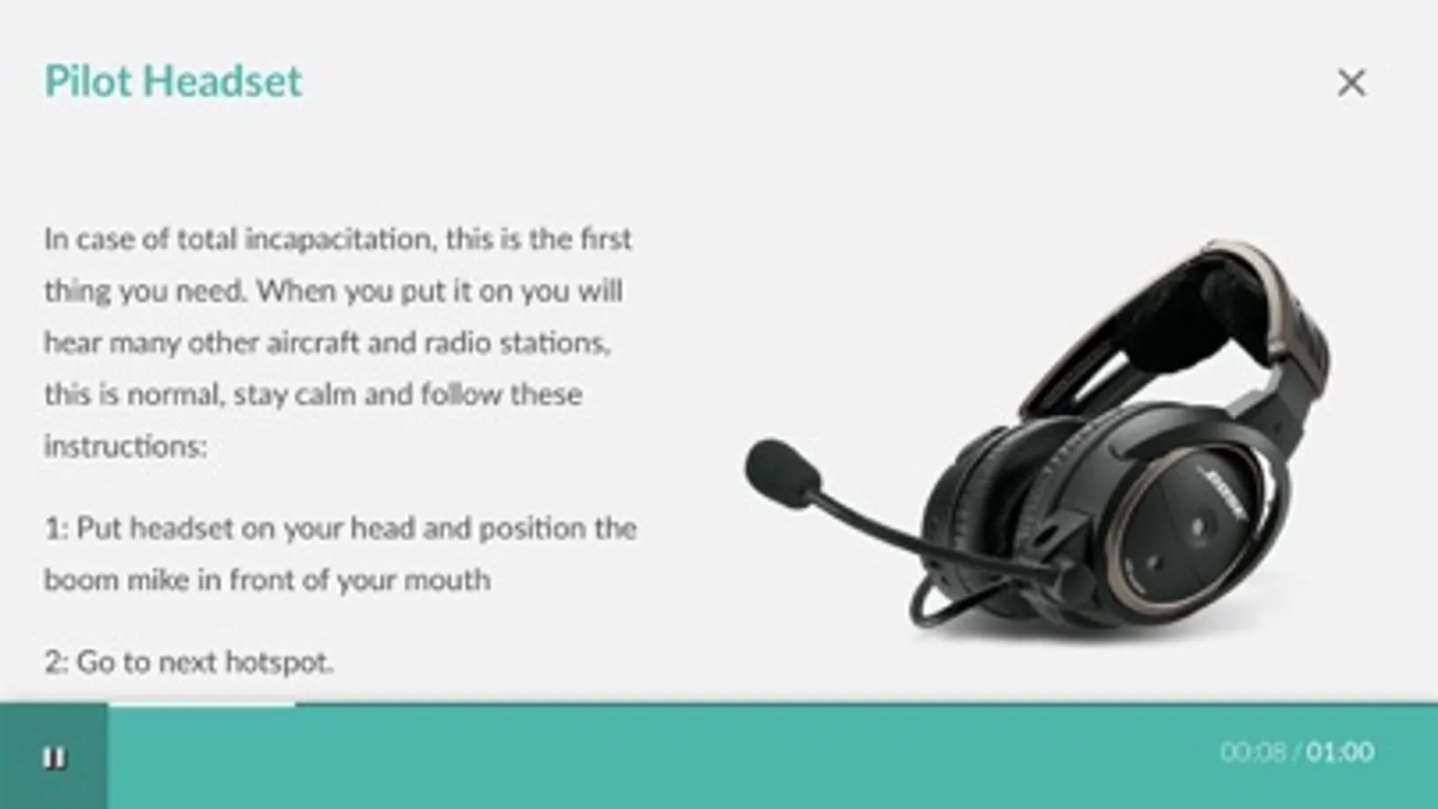 Step into the cockpit of a Boeing 737-800 and learn how to land the aircraft when both pilots are incapacitated. Interact with the hotspots and follow the instructions from an experienced airline pilot and learn by reading and listening to him explaining the steps how to bring the aircraft down.