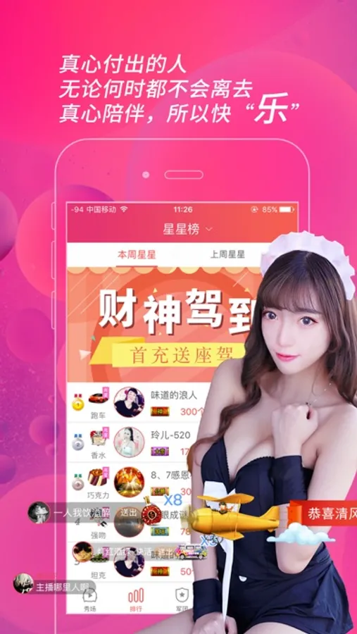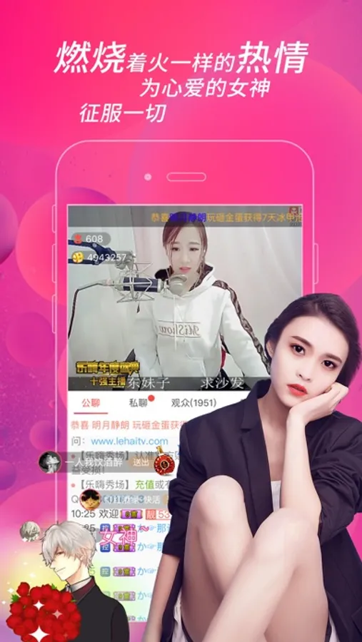 高颜值主播为你视频直播K歌唱响,表演逗趣,喊麦搞怪,激情PK,永久免费欣赏。快快下载安装乐嗨,漫漫长夜,从此不再空虚寂寞冷。