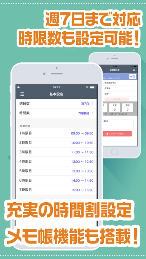 各科目で、科目名、教室名、先生、色分け、出席回数、欠席回数、遅刻回数、メモの登録を設定可能